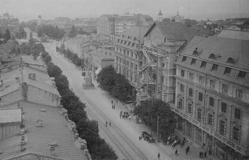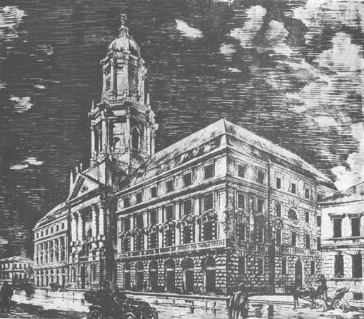 La construcción comenzó activamente, y parte del edificio estuvo listo para 1914, pero la Primera Guerra Mundial y los acontecimientos de 1917 impidieron la finalización de las obras. Ya en la época soviética, el edificio se terminó, pero se decidió abandonar la torre. El edificio se llamó Palacio del Trabajo y sirvió como centro del movimiento sindical: aquí funcionaban una biblioteca, una taquilla de teatro, una oficina de educación física, y se celebraban conferencias, conciertos y proyecciones de películas.